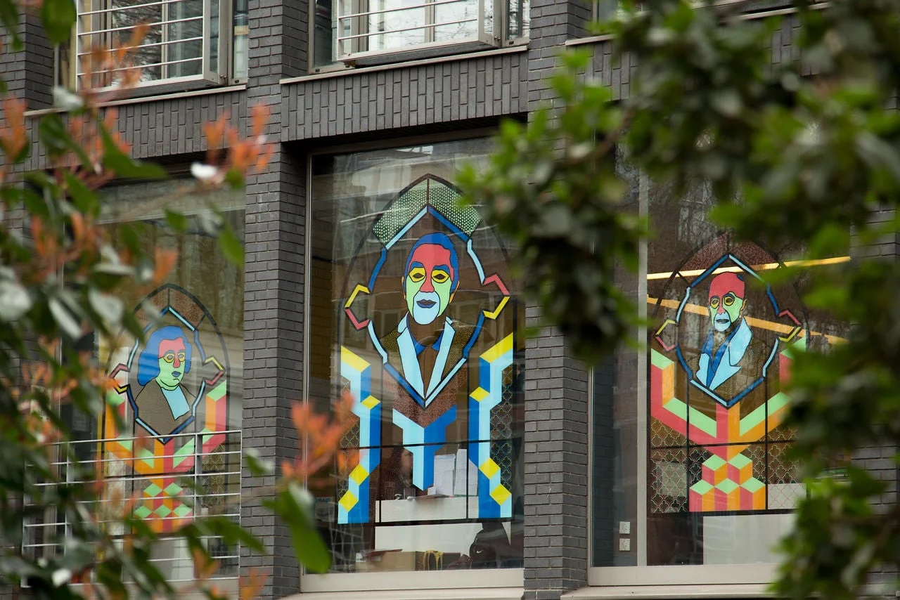 Each of the three windows is dedicated to one of the square’s most influential people; John Newton, the clergyman who wrote ‘Amazing Grace’, Peter Durand, a merchant who invented the process of tinning and preserving food and lastly, Eddie Piller, the founder of the square’s first nightclub, The Blue Note, which signalled the tide of the creative industries to the area.